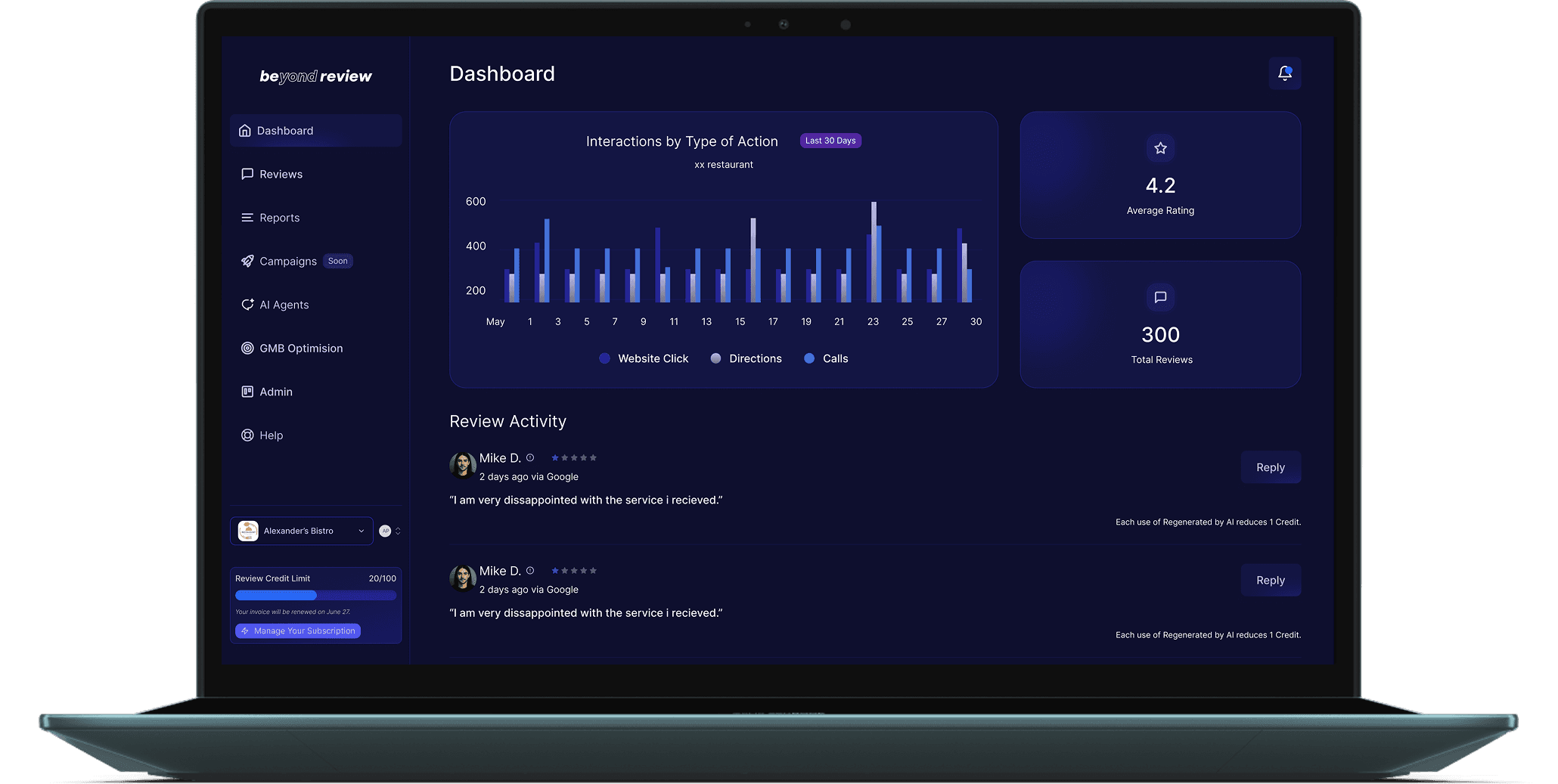 Beyond Review was conceived to simplify and elevate the way businesses manage their online reputation. In a world where reviews shape customer decisions, our vision was to offer a tool that doesn’t just monitor feedback — but acts on it, instantly, fluently, and at scale. With Beyond Review, businesses can reclaim their time, maintain brand voice consistency, and focus on growth — while our AI handles the heavy lifting of review management and customer engagement.