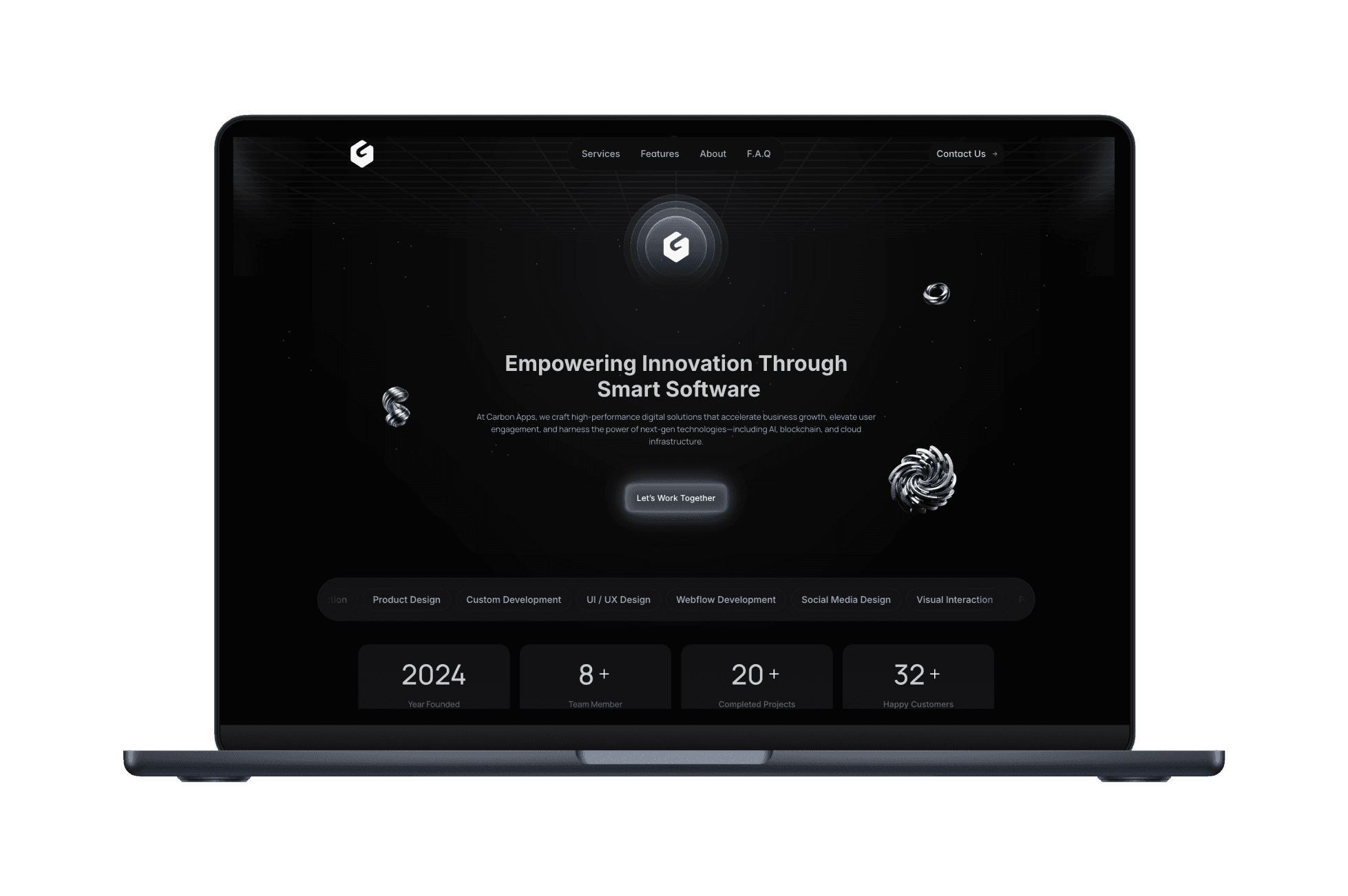 A modern, high-impact corporate website designed to communicate Carbon Apps’ value proposition, showcase services, and convert visitors into leads. Built with a bold, futuristic visual language and a clear information architecture, the site highlights the brand’s focus on smart software, innovation, and high-performance digital solutions.